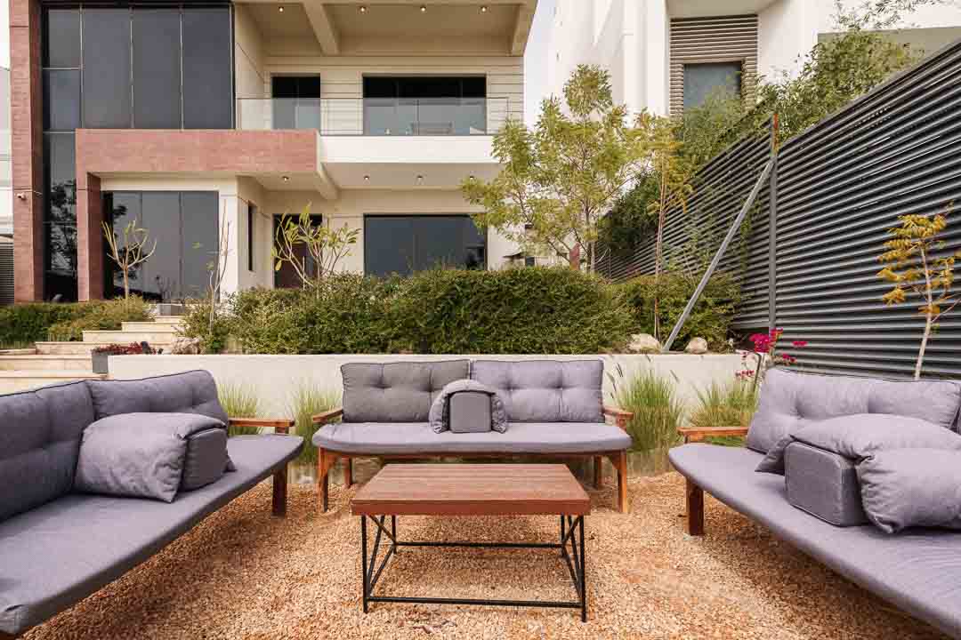- حديقة مع قعدات خارجيه مطلة على البحر