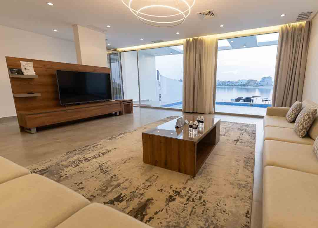 - صالات كبار بخدماتها مطلة علي حمام السباحة والخور